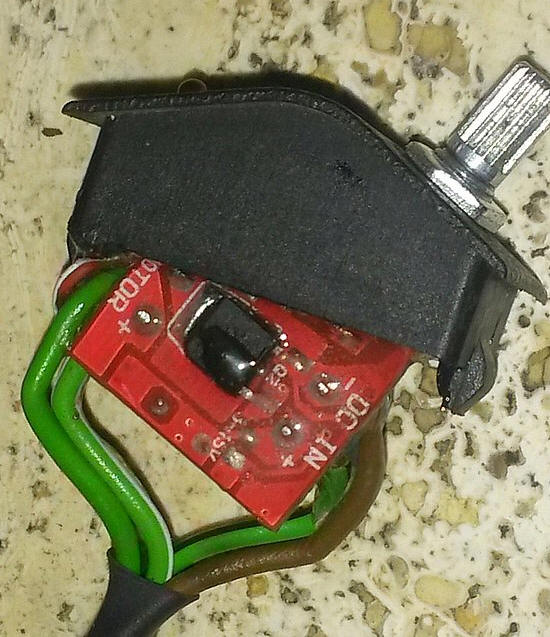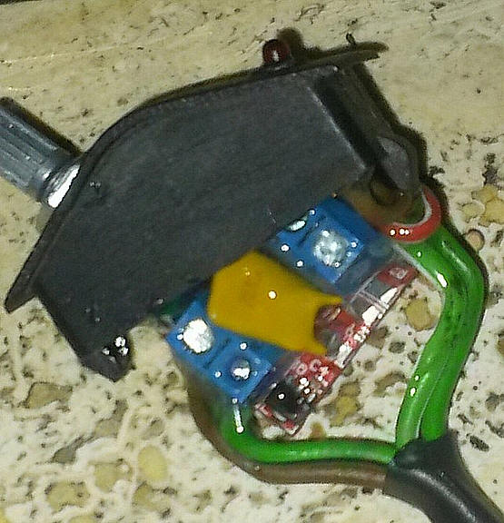 Having gotten spoiled by having variable heated grips on my K1100s, I decided my K75 needed them too. I built a hybrid of the two prior designs where I took the potentiometer from one of the PWM controllers at the top of the page and installed it in a BMW switch blank. I had to cut down the sides of the switch blank a bit to get the potentiometer to fit. When I was finished, I wrapped some electrical tape around it.