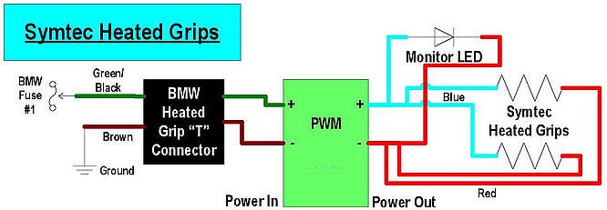 My first two variable heated grip projects were on bikes that had BMW heated grips from the factory. My K75 has Symtec heated grip elements. Each side has two heating elements, one for the high setting and one for the low setting. I hooked both elements up on each side to the output from the PWM so now I can get my grips as hot (or cool) as I want. The BMW part number for a switch blank is 32711459318 - about $2. By the way, if you're not into doing projects like this but still want variable heated grips then you can plop down $70 for a Heat-Troller from Warm-n-Safe to get variable heated grips. Wiring diagrams: