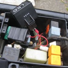 Kisan SignalMinder Flasher Relay & LED-Friendly BMU: Once I had the fuel system sorted out I started on some electrical upgrades. I started by swapping in a Kisan SignalMinder flasher relay so I can run LED turn signals and also an LED-friendly BMU (Bulb monitor unit) I made so that I can run LED brake and tail lights too. The red wire from the SignalMinder to the brake light wire from the BMU tells the SignalMinder to pause its timed auto-cancel feature when the brakes are applied.