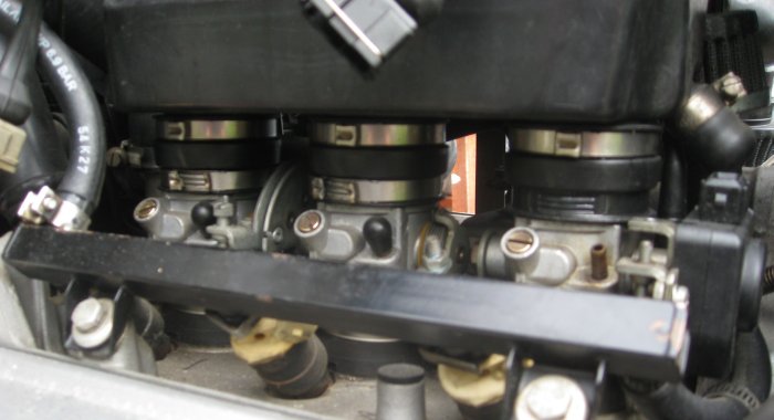 After I replaced the vacuum caps with OEM ones I took a look at the intake manifolds under the TBs and noticed they were cracked - not surprising for a bike of this age and miles. The first step was to use a Dremel cutting wheel to get rid of the stupid Oetiker clamps on the upper boots in order to remove the plenum.