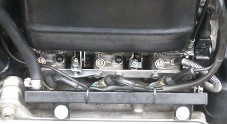 Fuel Injectors: Given their appearance, I assume that the fuel injectors are the original ones and had most likely have never been serviced. I considered getting them reconditioned but instead decided to install some Bosch Series II fuel injectors. These have four holes in them instead of one to atomize the fuel better, theoretically leading to better, more complete combustion. I've run these in several other of my K bikes and they perform well so I decided to buy a set of three reconditioned ones for this bike.