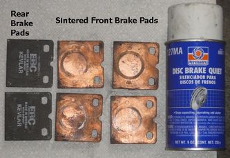 Brake Pads: For additional grab I use sintered pads in the front. I use Permatex Disc Brake Quiet on the backs of the brake pads to preclude disc brake squeal. Here are the pads before I sprayed them down.