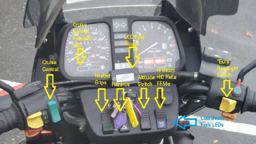 Cruise Control: Rostra Electronic Cruise Control operated by a K1100LT windscreen switch. I wired up the extra indicator next to the low fuel indicator in the instrument cluster to illuminate when the cruise control is engaged. So that it wouldn't be too bright at night I installed an amber LED behind the red lens. The cruise control puts out a ground signal when engaged so I got the power for the indicator from the backlight socket next to it.
